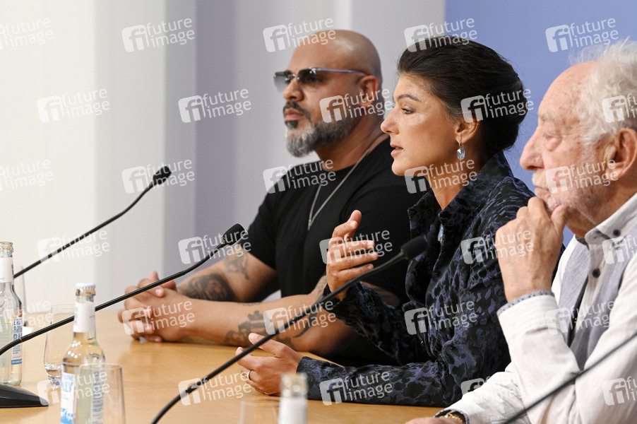 Massiv, Sahra Wagenknecht und Dieter Hallervorden bei der Pressekonferenz zur Friedenskundgebung am 13. September im Tagungszentrum im Haus der Bundespressekonferenz. Berlin, 08.09.2025