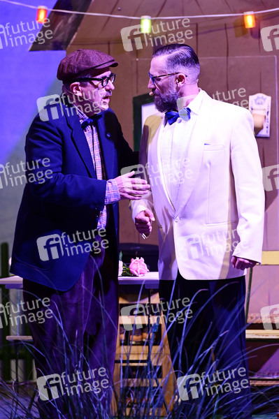 Alexander G. Schäfer und Bürger Lars Dietrich bei der Premiere des Theaterstücks 'Maxe Baumann - Ferien ohne Ende' während der Beelitzer Festspiele 2025 auf der Freilichtbühne. Beelitz, 14.08.2025