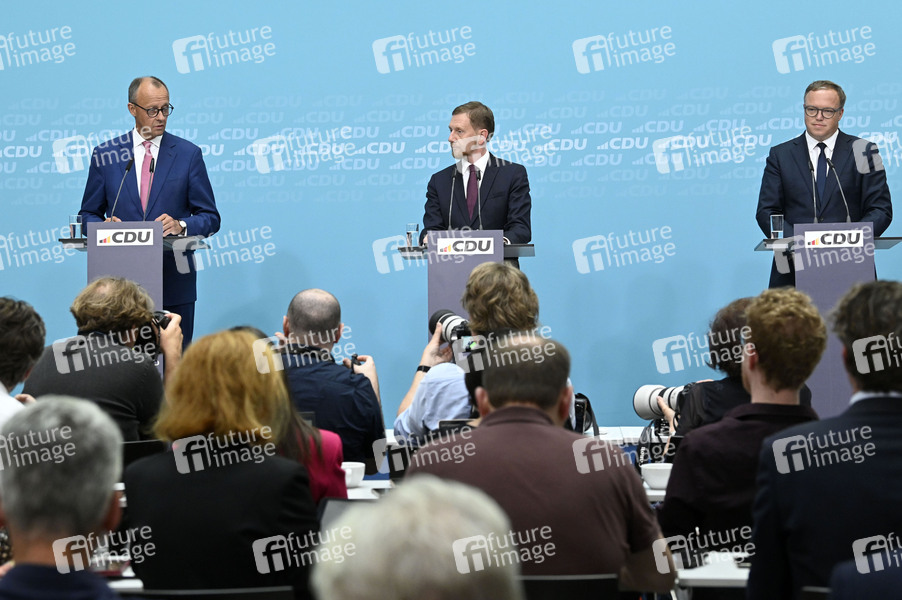 Friedrich Merz, Michael Kretschmer und Mario Voigt bei der Pressekonferenz der CDU nach den Landtagswahlen in Thüringen und Sachsen im Konrad-Adenauer-Haus. Berlin, 02.09.2024