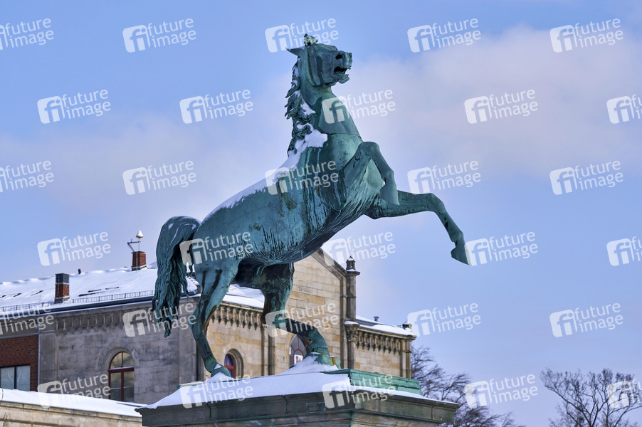 Das verschneite Niedersachsenross vor der Leibniz-Universität. Hannover, 09.02.2021