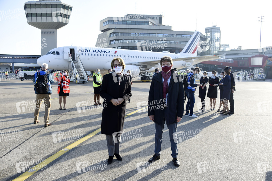 Botschafterin Anne-Marie Descotes und Flughafenchef Engelbert Lütke Daldrup beim letzten Abflug. Mit der Inbetriebnahme des Flughafens Berlin Brandenburg Willy Brandt (BER) wird der gesamte Luftverkehr der Hauptstadtregion an einem Standort konzentriert. Der Flughafen Tegel, kurz TXL, schließt am 8. November. 60 Jahre nach dem ersten Linienflug von Air France wird am 8. November ein Flugzeug der französischen Airline zum allerletzten Mal von dem Flughafen im Nordosten Berlins starten und Adieu sagen. Berlin, 08.11.2020