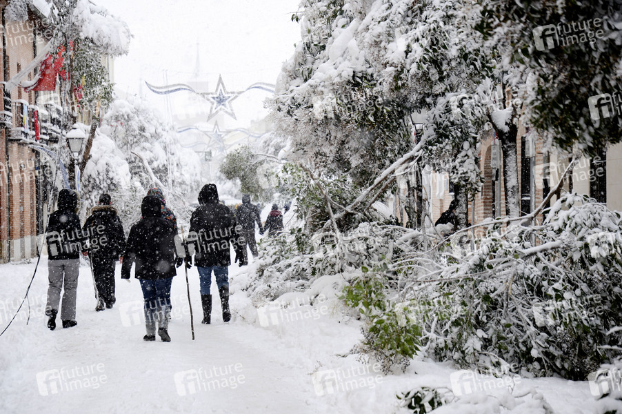Das Sturmtief Filomena sorgt in der Region Madrid und anderen Teilen Spaniens mit starken Schneefällen für Chaos. Die Hauptstadt Madrid wurde durch historisch heftigen Schneefall lahmgelegt. Seit 50 Jahren hat es nicht so geschneit. Der Verkehr ist in weiten Teilen des Landes zusammengebrochen. Alcalá de Henares, 09.01.2021