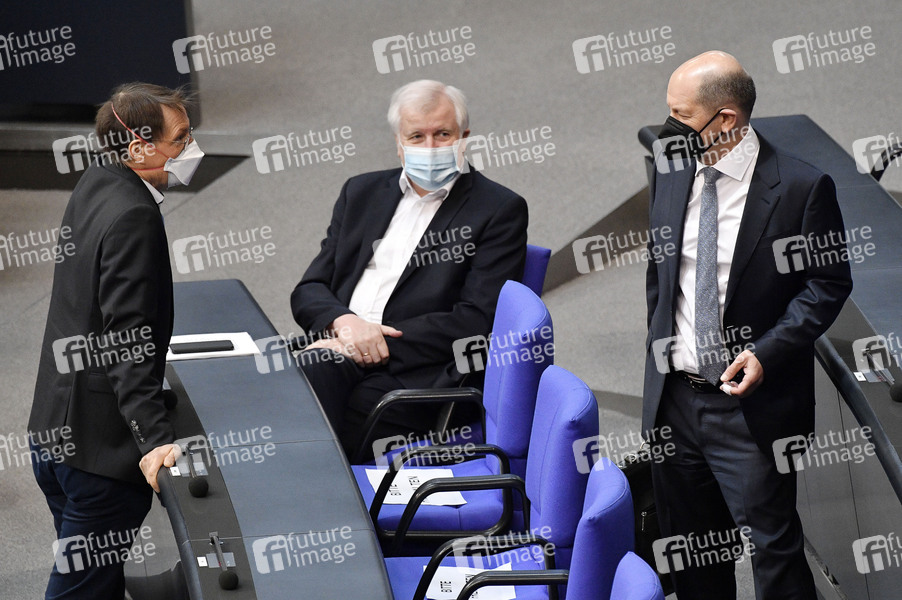 Karl Lauterbach, Horst Seehofer und Olaf Scholz in der 222. Sitzung des Deutschen Bundestages im Reichstagsgebäude. Berlin, 16.04.2021