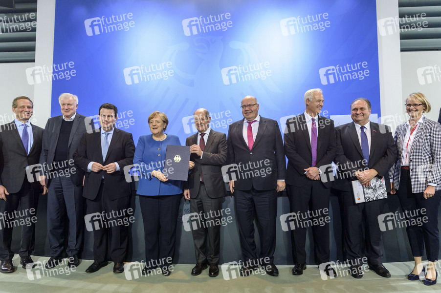 Eric Schweitzer, Horst Seehofer, Hubertus Heil, Angela Merkel, Olaf Scholz, Peter Altmaier, Carl Martin Welcker, Hans Peter Wollseifer und Anja Karliczek bei einer Pressekonferenz zur Unterzeichnung einer Absichtserklärung durch Vertreter der Bundesregierung und verschiedener Verbände und Institutionen zur Fachkräftezuwanderung im Berliner Bundeskanzleramt. Berln, 16.12.2019