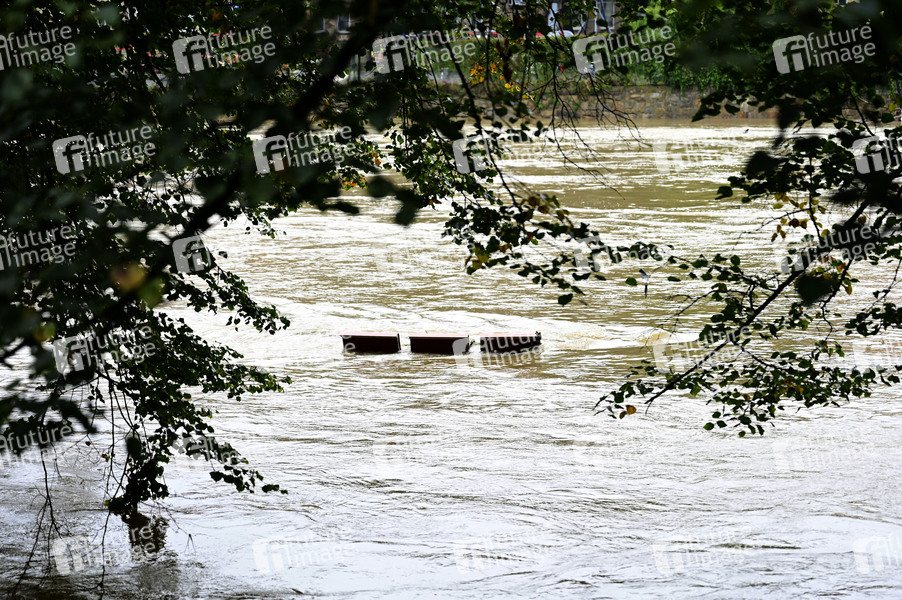 Sitzgelegenheiten gucken nur wenige Zentimeter aus dem Wasser, Nahe der der Altstadtbrücke. An der Neiße in Görlitz wurde am Morgen um 8:00 Uhr der Scheitelpunkt erreicht. Bei einem Wert von 5,57 m, bei einem Durchfluss von 309 m3/s, lag dieser 3 Zentimeter unterhalb der Alarmstufe 4. Seit dem geht der Wasserstand der Neiße langsam zurück. Der aktuelle Pegelstand beträgt 5,18 m. Görlitz, 16.09.2024