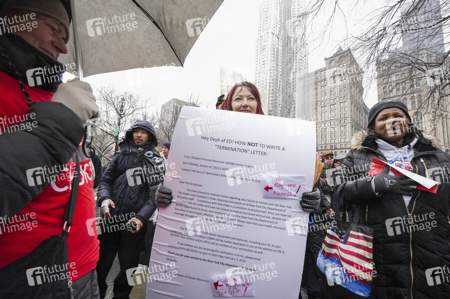 Über 300 Stadtarbeiter und andere protestieren mit einem Marsch über die Brooklyn Bridge, gegen die Ankündigung der Stadt, dass kommunale Angestellte ohne Covid-19-Impfung bis zum Ende der Woche entlassen würden. New York, 07.02.2022