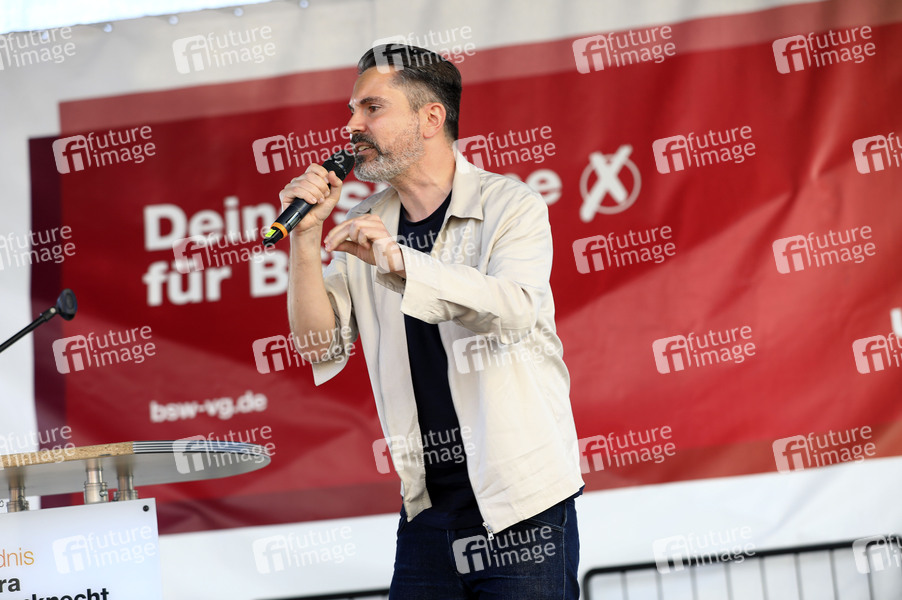 Fabio De Masi bei einer Wahlkampfveranstaltung des Bündnis Sahra Wagenknecht - Vernunft und Gerechtigkeit (BSW) auf dem Richard-Wagner-Platz. Leipzig, 04.06.2024