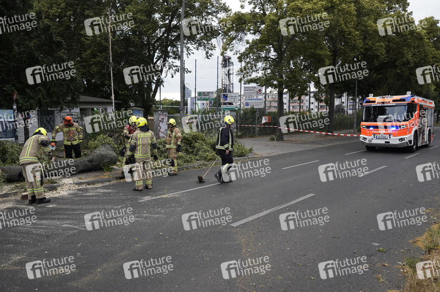 Am Eingang des Willy Sänger Sportplatz wurde durch eine Sturmböhe eine alte Eiche auf die Fahrbahn der Köpenicker Landstraße gelegt. Die Berliner Feuerwehr beseitigt den Baum. Berlin, 23.06.2025