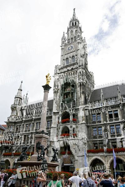 Marienplatz, Sitz des Oberbürgermeisters und der Stadtverwaltung, erbaut 1867 bis 1909 von Georg von Hauberrisser, Neugotik, der 85 m hohe Rathausturm mit dem Münchner Kindl an der Turmspitze enthält das fünftgrößte Glockenspiel Europas, 43 Glocken, 400 Zimmer