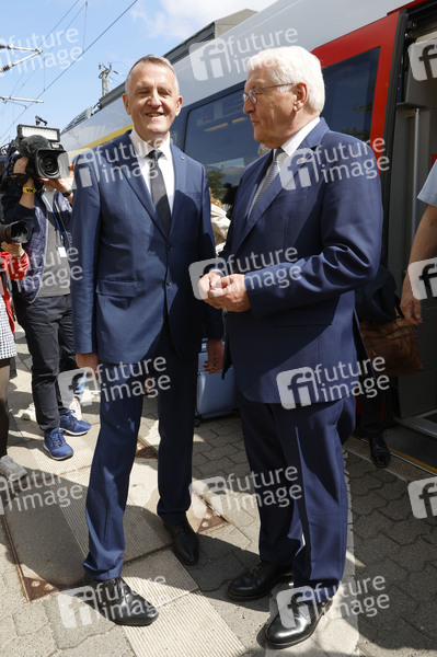 Frank-Walter Steinmeier mit Bürgermeister Manfred Wilde auf dem Weg durch die Stadt Delitzsch zum Rathaus. Steinmeier verlegt seinen Amtssitz für drei Tage nach Sachsen. Der Besuch im Landkreis Nordsachsen ist Teil der Reihe 'Ortszeit Deutschland', bei der das Staatsoberhaupt regelmäßig in verschiedene Regionen reist, um mit Bürgerinnen und Bürgern ins Gespräch zu kommen und die Entwicklung vor Ort kennenzulernen. Delitzsch, 20.05.2025
