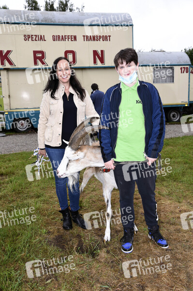 Jana Mandana Lacey-Krone mit Sohn Alexis beim Presserundgang auf der Circus Krone-Farm. Weßling, 29.06.2020