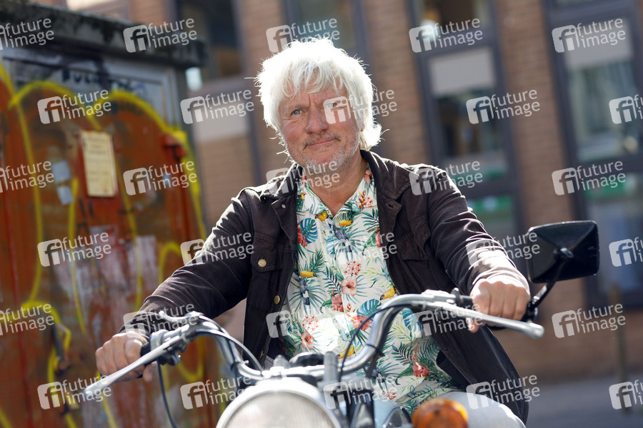 Jürgen Becker in einem Motorrad mit Beiwagen beim Fotocall zum WDR-Film 'Besuch aus dem Westen - Jürgen Becker unterwegs im Osten Deutschlands' im Mauritiussteinweg. Köln, 22.08.2019
