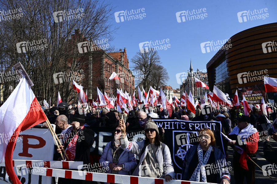 Eine Demo von rechten und nationalen Gruppen aus Polen demonstrieren u.a. gegen die deutsche Asylpolitik am Grenzübergang Görlitz/Zgorzelec - Stadtbrücke, welche aus Sicherheitsgründen mehrere Stunden gesperrt war. Görlitz/Zgorzelec, 22.03.2025