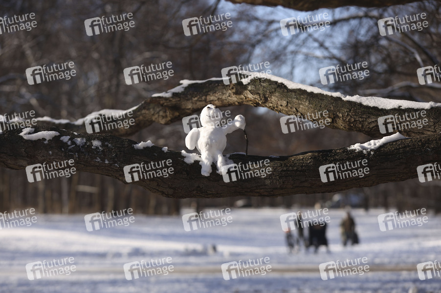 Mini-Schneemann auf einem Ast sitzend, gesehen beim Winterspaziergang im Großen Tiergarten. Berlin, 31.01.2021