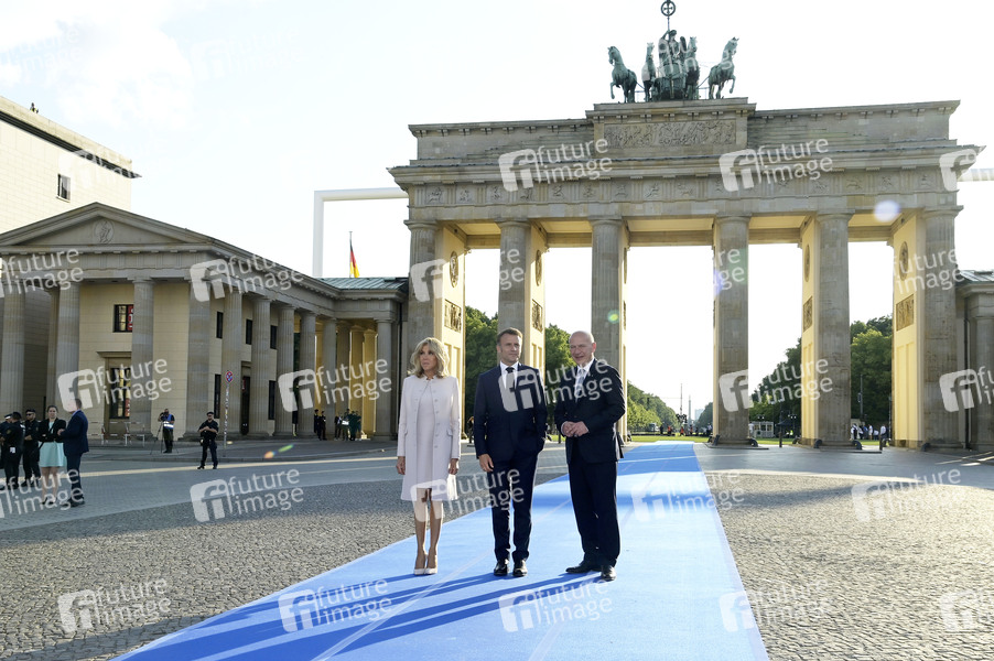 Brigitte Macron, Emmanuel Macron und Kai Wegner beim Gang durchs Brandenburger Tor. Berlin, 26.05.2024