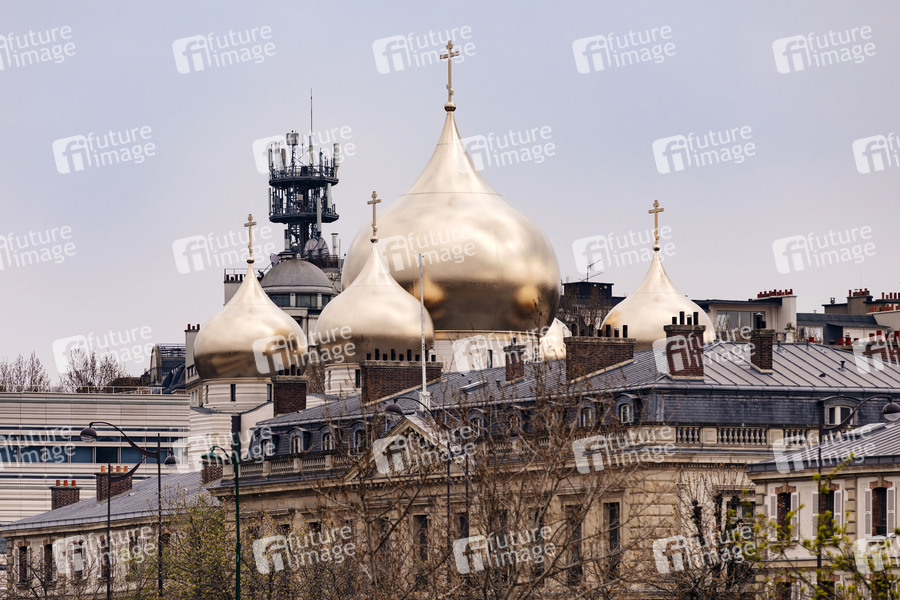 Ein Sendemast des Rundfunksenders MCS ragt über die Dreifaltigkeitskathedrale. Paris, 30.03.2019