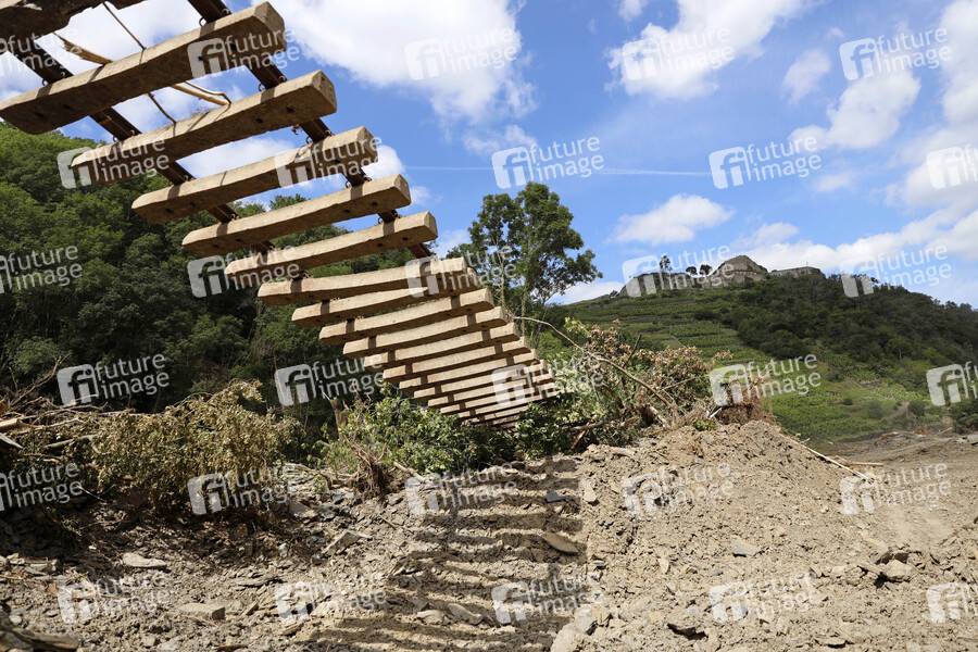 Nach dem Jahrhunderthochwasser in der Eifel durch heftige Regenfälle und Dauerregen mit Überschwemmungen und Überflutungen haben die Aufräumarbeiten im Ahrtal große Fortschritte gemacht. Einheiten von Polizei, THW, Bundeswehr und Feuerwehr mitsamt vielen freiwilligen Helfern haben Straßen geräumt, Schutt und Schlamm entfernt und die Menschen versorgt. Der Wiederaufbau wird trotzdem Jahre dauern. Im Bild Flutschäden an einer Eisenbahnbrücke nahe der Ortschaft Rech, in der die Flut viele Häuser zerstörte, 30.07.2021