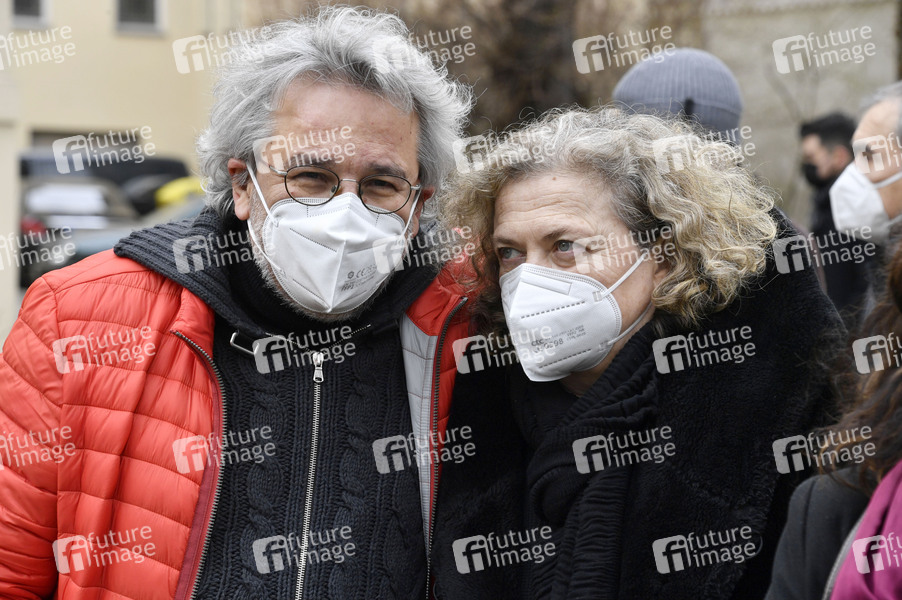 Can Dündar mit Ehefrau Dilek Dündar bei der Pressekonferenz des KulturForum TürkeiDeutschland zur Solidarität mit den gesamten demokratischen Kräften in der Türkei, insbesondere mit inhaftierten Schriftsteller*innen, Künstler*innen, Journalist*innen, Gewerkschafter*innen und Politiker*innen vor dem Maxim Gorki Theater. Berlin, 23.03.2021