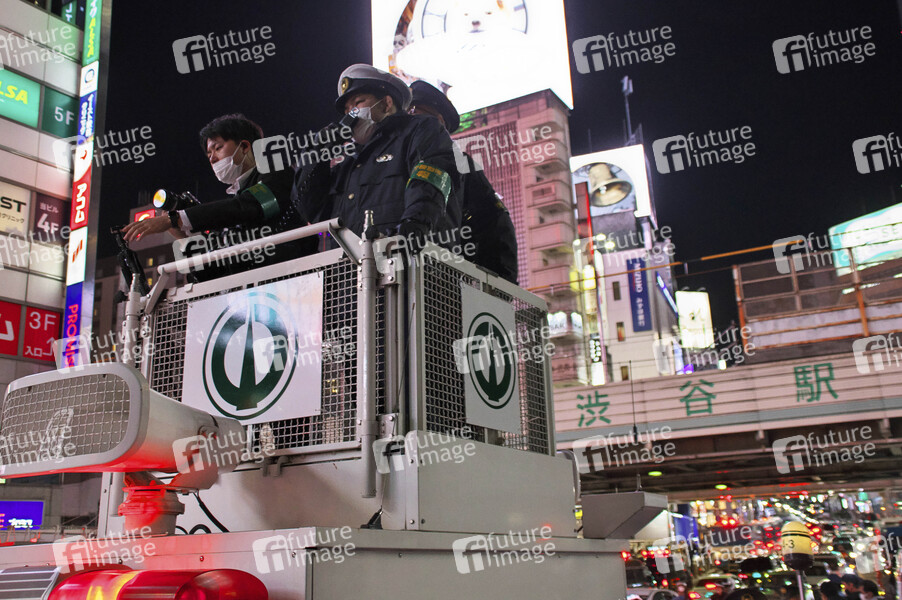Kostümerte feiern Halloween im Stadtteil Shibuya. Die Sicherheitsvorkehrungen für das Halloween-Event, wenige Tage nach der Massenpanik in der südkoreanischen Stadt Seoul, wurden verschärft. An der Scramble-Kreuzung forderte die Polizei die Menschen immer wieder auf, in Bewegung zu bleiben und versuchten so die Menschenmassen entlang der Kreuzung zu steuern.. Tokio, 31.10.2022