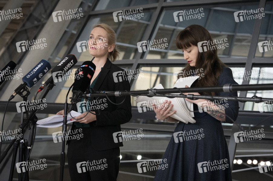 Ines Schwerdtner und Heidi Reichinnek bei einem Pressestatement der Bundestagsfraktion der Partei Die Linke im Reichstagsgebäude. Berlin, 09.04.2025