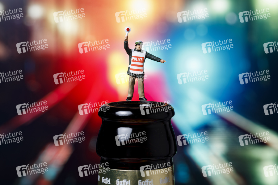 Ein Polizist steht oben auf einer Bierflasche