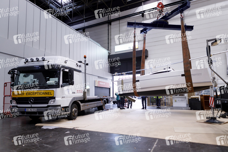 Verladen einer Segelyacht auf der 51. Boot Düsseldorf - Bootsmesse und Wassersportmesse in der Messe Düsseldorf. Düsseldorf, 19.01.2020