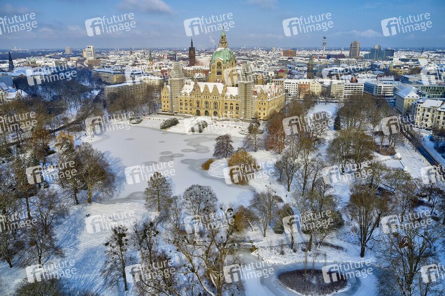 Luftbild vom verschneiten Maschpark mit dem Neuen Rathaus im Winter. (Der Drohnenflug wurde ordnungsgemäß bei der Polizei Leitstelle Hannover angemeldet) Hannover, 09.02.2021