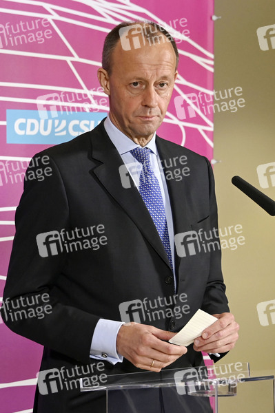 Friedrich Merz beim Statement der CDU/CSU-Bundestagsfraktion nach der fraktionsoffenen Sitzung auf der Fraktionsebene im Reichstagsgebäude. Berlin, 24.02.2022