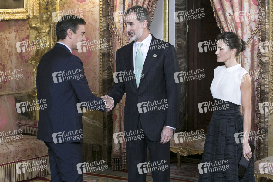 Pedro Sanchez, König Felipe von Spanien und Königin Letizia von Spanien bei einem Empfang anlässlich der UN-Klimakonferenz 2019 im Palacio Real. Madrid, 02.12.2019
