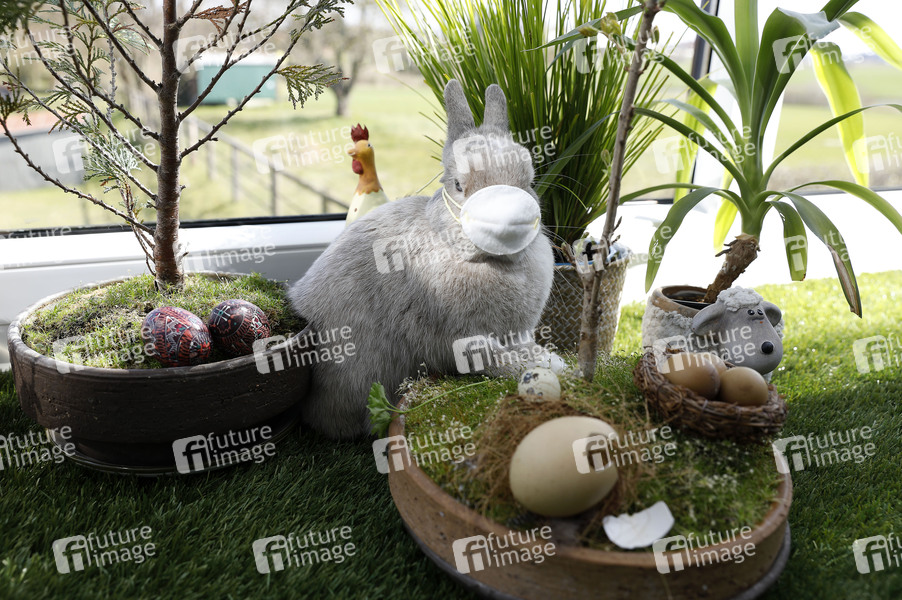 Hase, Osterhase, Kaninchen, Zwergkaninchen, Easter Bunny, Frohe Ostern, Oster-Geschenke, Ostern, Osternest, Ostersaison, Osterzeit, Ostereier, Feiertag, Ostersonntag, Ostermontag, Atemschutz, Atemschutzmaske, Virenschutz, Schutzmaske, Schutzmasken, Atemschutzmasken, Mundschutz, Mund-Schutz, Mundschutzpflicht, Mundschutz-Pflicht, Mund-Nase-Schutz, Mund-Nasen-Schutz, MNS, Ausbreitung, Maskenzwang, Maskenpflicht, Infektionsgefahr der Öffentlichkeit, Lock Down, Lockdown, Öffentlichkeit, Eindämmung, Seucheneindämmung, anstecken, infizieren, Vorbeugung, Prävention, schützen, Einschränkung, Verzicht, Seuchenschutz, Corona-Schutz, Virus, Viren, Corona, Sars-CoV-2, Covid-19, Coronavirus, Coronaviren, Corona-Virus, Corona-Viren, Ansteckung, Ansteckungsgefahr, Epidemie, Pandemie, Infektion, Infektionen, Corona-Maßnahmen, Symbolfoto, Symbolbild