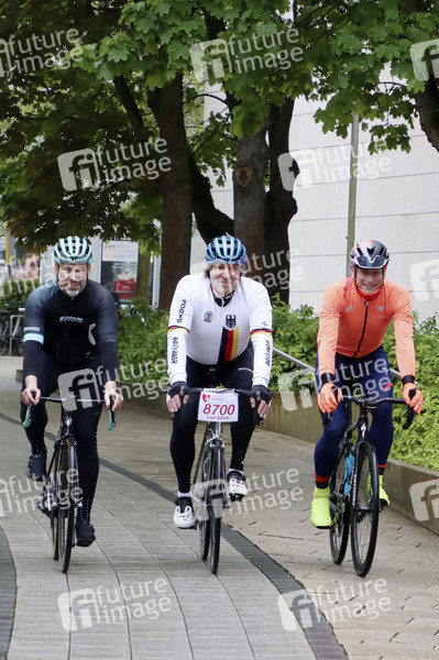 Björn Schröder, Uwe Rohde und Lorenz Krüger beim Start der HerzRadtour zugunsten der Stiftung KinderHerz vor dem Alstertal-Einkaufszentrum. Hamburg, 26.05.2021