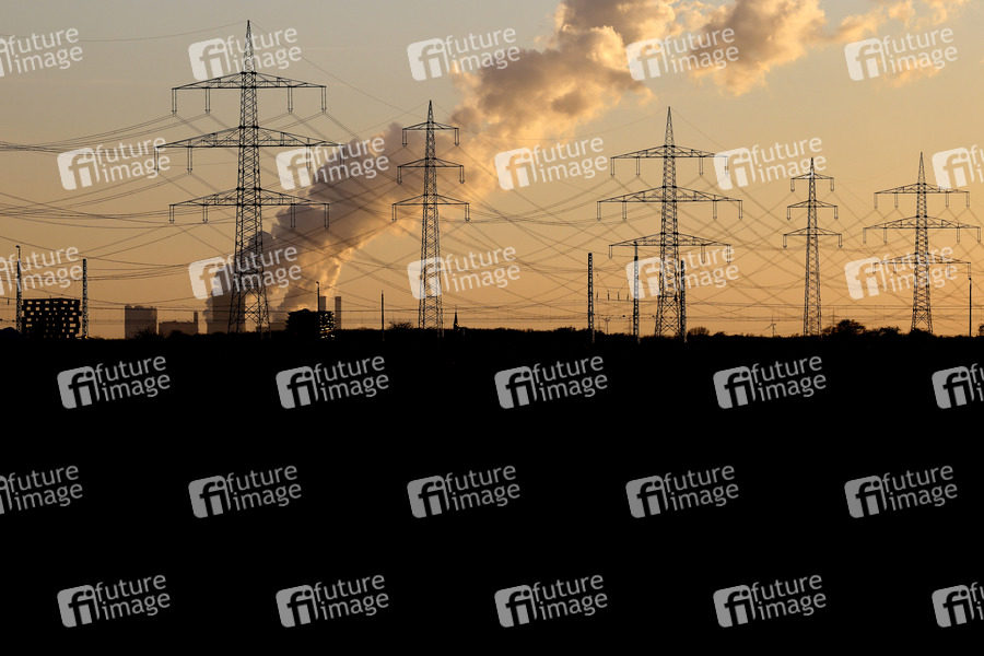 Das Kohlekraftwerk Niederaußem und umliegende Stromleitungen zeichnen sich gegen die untergehende Sonne ab. Aus Sicht von Brandenburgs Ministerpräsident Dietmar Woidke (SPD) muss nach dem Angriff Russlands auf die Ukraine der auf 2030 vorgezogene Kohleausstieg neu diskutiert werden. (Themenbild, Symbolbild) Bergheim, 28.02.2022