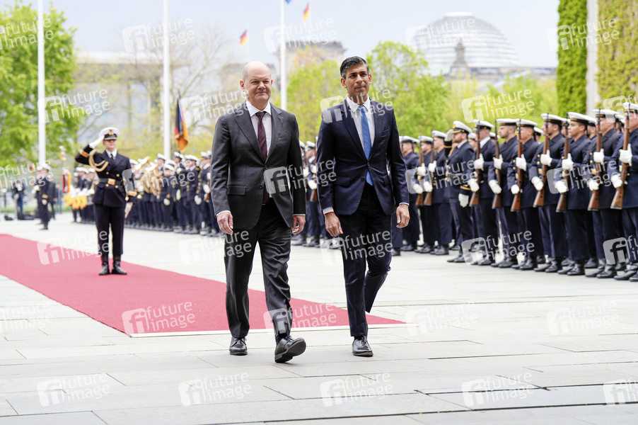 Olaf Scholz und Rishi Sunak beim Empfang des Premierministers des Vereinigten Königreichs von Großbritannien und Nordirland mit militärischen Ehren und zu einem gemeinsamen Gespräch mit dem Bundeskanzler mit anschließendem Pressestatement im Bundeskanzleramt. Berlin, 24.04.2024