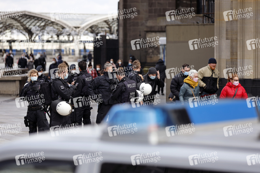 Am Rande einer unangemeldete Demo von Kritikern der Corona-Maßnahmen vor dem Kölner Dom führten Polizei und Ordnungsamt zahlreiche Kontrollen auf Einhaltung der Corona-Maßnahmen wie Mindestabstand und Maskenpflicht durch. Ab Montag will NRW wegen der steigenden Inzidenzzahlen noch strengere Corona-Regeln anwenden. Köln, 27.03.2021