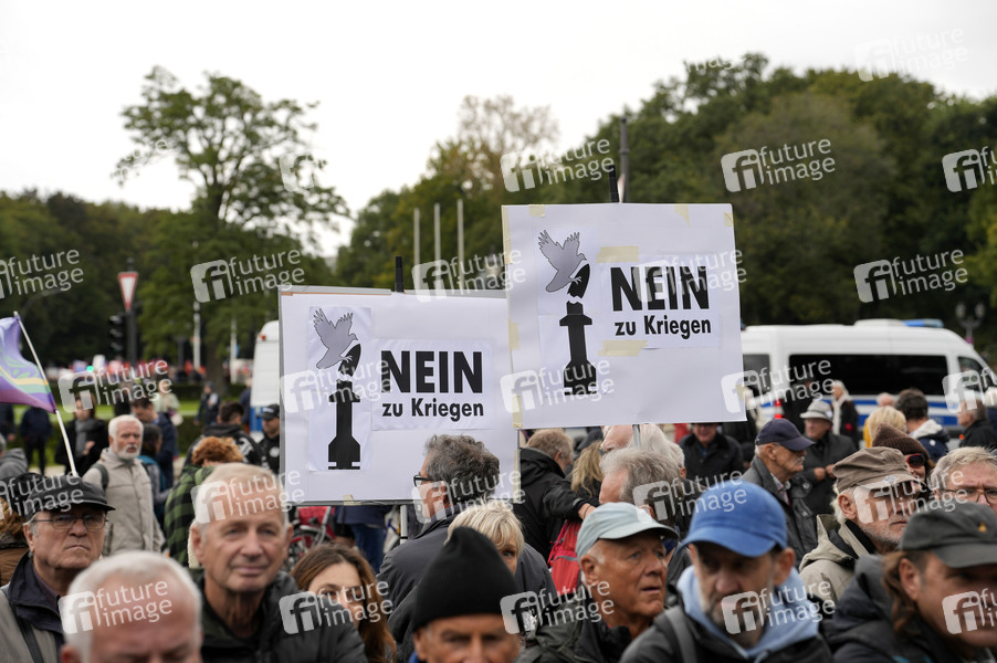 Friedensdemonstration unter dem Motto 'Nein zu Krieg und Hochrüstung! Ja zu Frieden und internationaler Solidarität' vor der Siedessäule am Großen Stern. Berlin, 03.10.2024