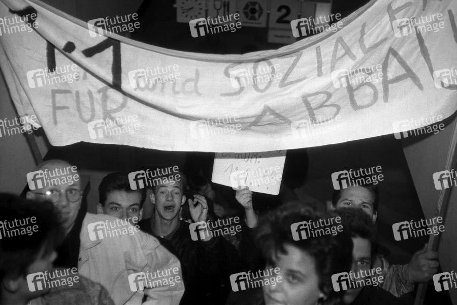 DDR, Demo, Demo, Demonstranten, Demonstrationen, Protest, Protestzug, Proteste, Protestdemo, Kundgebung, Wiedervereinigung, Währungsunion, Umtausch, Wirtschaft, Finanzen, Geld, Geldumtausch, Ostgeld, Ostmark, D-Mark, Aktion, Sparkonto, Umtauschkurs, Wechselkurs, Politik