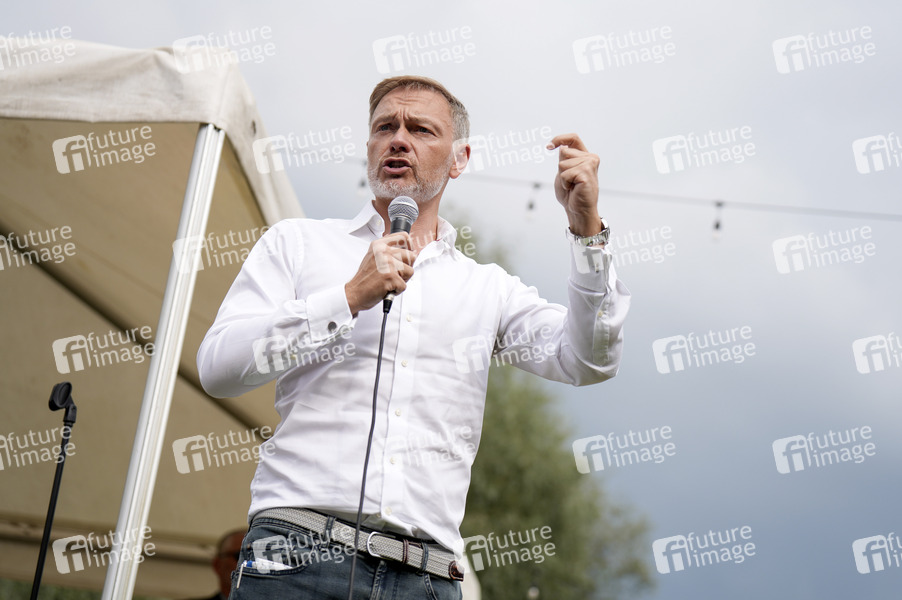 Christian Lindner bei einer Wahlkampfveranstaltung der FDP zur Landtagswahl in Brandenburg im Mahlower Seebad. Blankenfelde-Mahlow, 15.08.2024