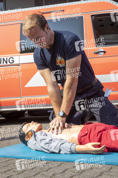 Demonstration einer Notfallsituation mit Erstversorgung anlässlich des Tages der 'Ersten Hilfe' im Führungs- und Schulungszentrum der Feuerwehr Köln. Köln, 11.09.2020