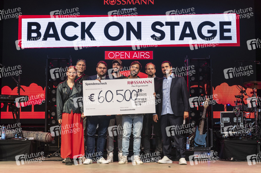 Vertreter Coronakünstlerhilfe, Max Giesinger, Raoul Roßmann und Nico Röger bei der Scheckübergabe vor dem Max Giesinger Charitykonzert im Rahmen der Konzertreihe 'Back on Stage' auf der Gilde Parkbühne. Hannover, 13.09.2021