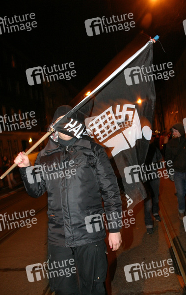 Antifa Demo (Antifaschistische Aktion) in der Berliner Samariterstrasse. Vor 15 Jahren wurden der junge Hausbesetzer und Antifaschist Silvio Meier auf dem U-Bahnhof Samariterstraße bei einem Überfall von Neonazis getötet