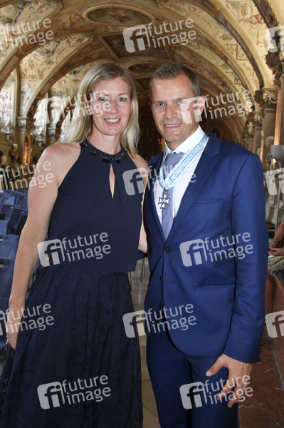 Tobias Angerer mit Ehefrau Romy Angerer bei der Verleihung des Bayerischen Verdienstordens 2019 im Antiquarium der Münchner Residenz. München, 22.07.2019
