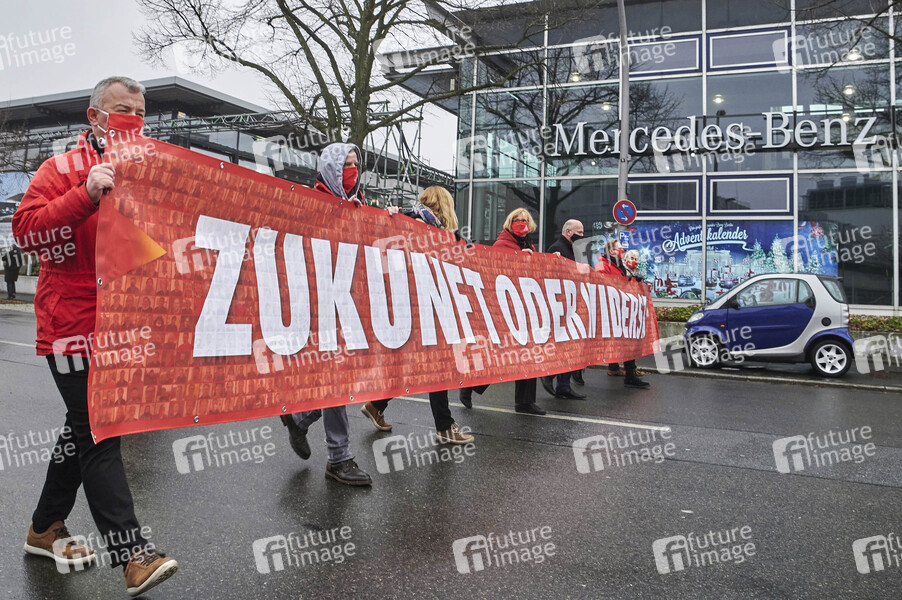 Demonstration von Beschäftigten des Mercedes Benz-Werks in Berlin-Alt-Mariendorf unter dem Motto 'Zukunft oder Widerstand'. Gemeinsam mit der Gewerkschaft IG Metall fordern sie, dass der Stilllegungsbeschluss zumindest teilweise zurückgenommen wird. Berlin, 09.12.2020