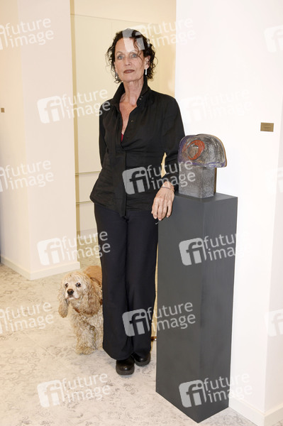 Karin Müller-Wohlfahrt mit Hund Willy im Salon Figaro nach der Wiedereröffnng von Friseursalons nach Lockerung der Corona Maßnahmen. München, 04. 05.2020