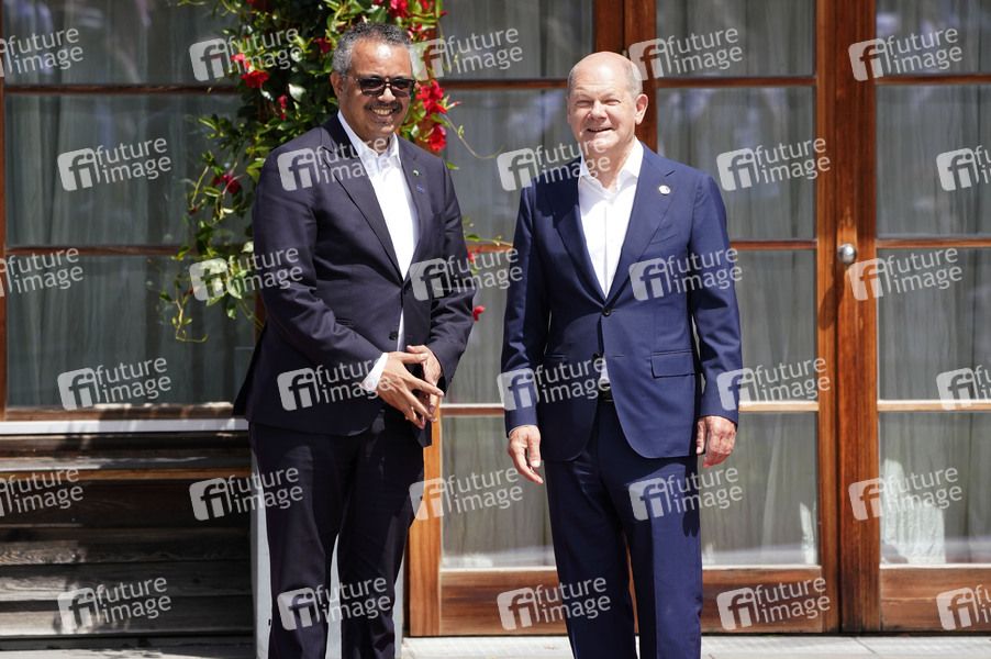 Tedros Adhanom Ghebreyesus und Olaf Scholz beim Fototermin zum erweiterten Familienfoto im Rahmen der Outreach-Arbeitssitzung am zweiten Tag des G7-Gipfels auf Schloss Elmau. Die Staats- und Regierungschefs der G7-Gruppe kommen offiziell unter dem Motto 'Fortschritt hin zu einer gerechten Welt' zusammen und werden globale Themen wie Krieg, Klimawandel, Hunger, Armut und Gesundheit diskutieren. Der Gipfel wird vom anhaltenden russischen Krieg gegen die Ukraine überschattet. Klais, 27.06.2022
