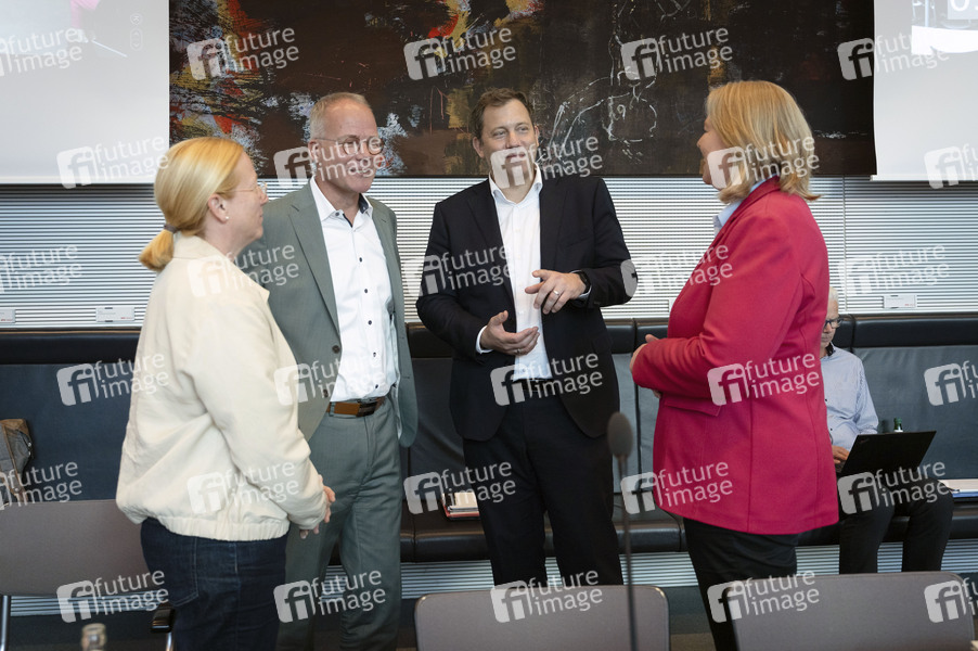 Dagmar Schmidt, Matthias Miersch, Lars Klingbeil und Bärbel Bas bei der Klausursitzung des SPD-Parteivorstandes im Reichstagsgebäude. Berlin, 08.09.2025