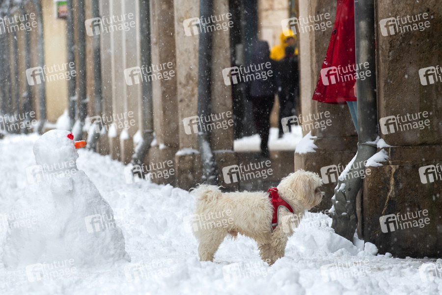 Schneemann und Hund - Die Region Madrid nach dem Sturmtief Filomena, das in weiten Teilen Spaniens mit starken Schneefällen für Chaos sorgte. Starker Schneefall legte das öffentliche Leben nahezu lahm. Seit 50 Jahren hatte es nicht so geschneit. Alcalá de Henares, 10.01.2021