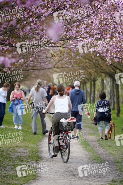 Blühende Japanische Kirschbäume entlang der TV-Asahi-Kirschblütenallee am Berliner Mauerweg im Stadtteil Lichterfelde und Teltow. Berlin, 07.04.2024