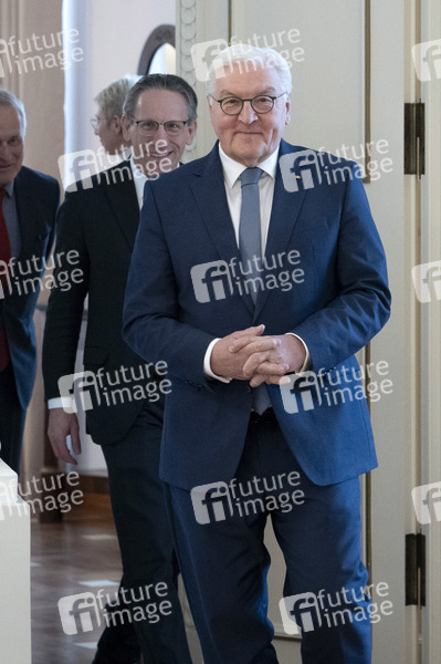 Jörg Kukies und Frank-Walter Steinmeier bei der Übergabe der Wohlfahrtsmarken 2025 durch den Bundesminister der Finanzen an den Bundespräsidenten im Schloss Bellevue. Berlin, 21.02.2025
