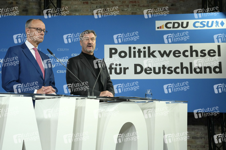Friedrich Merz und Markus Söder bei der Pressekonferenz zur gemeinsamen Sitzung der Vorstände der CDU Deutschlands und der CSU Bayern zur Beratung und Beschlussfassung des Wahlprogramms der CDU/CSU zur Bundestagswahl 2025 im Hotel Telegraphenamt. Berlin, 17.12.2024