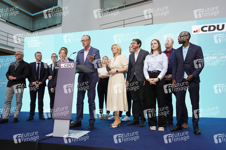 Friedrich Merz mit Parteikollegen beim Wahlabend der CDU nach der Europawahl im Konrad-Adenauer-Haus. Berlin, 09.06.2024